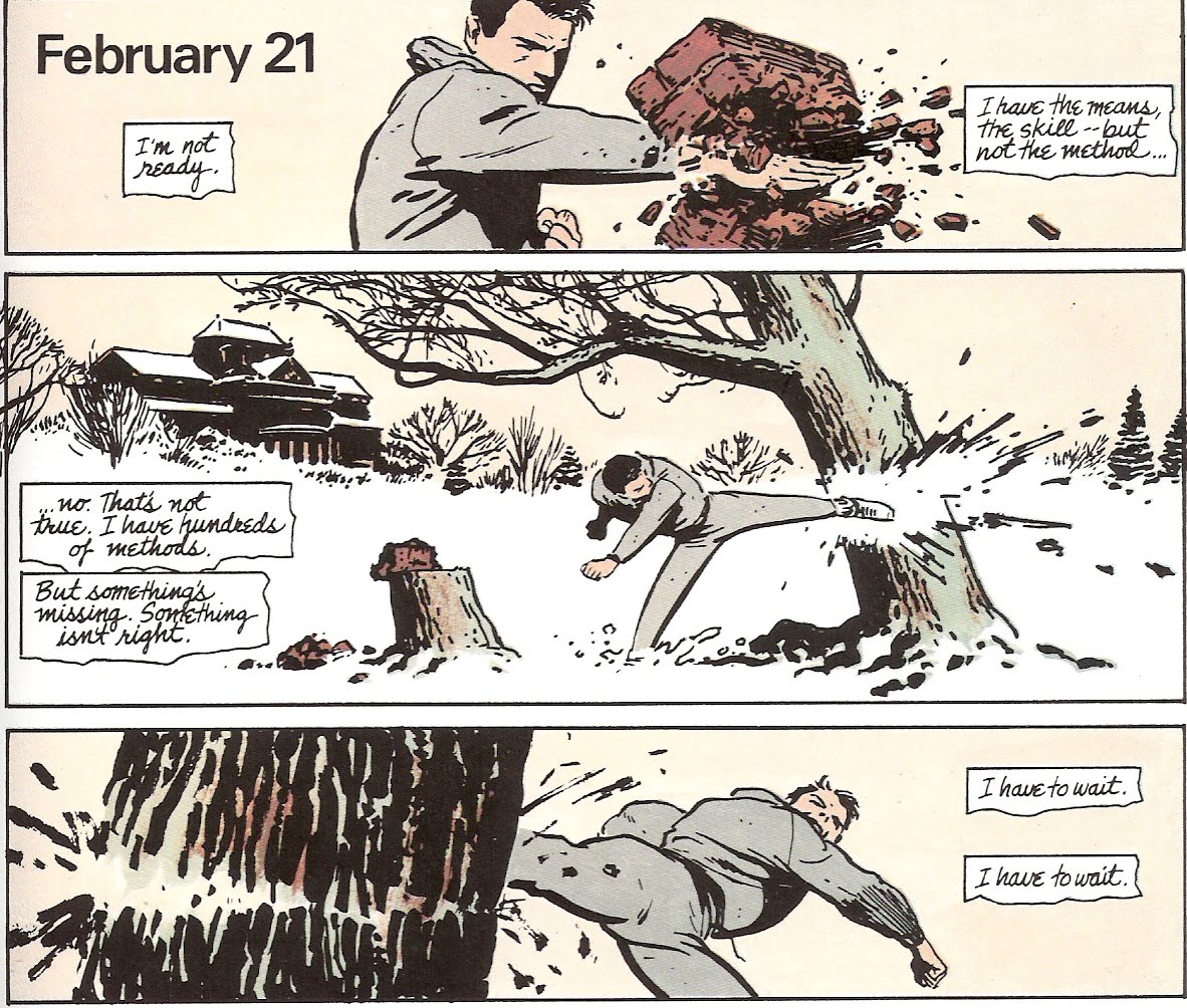 Y muy buen articulo de Victor. Recuerdo siempre (como mí página favorita de la obra) aquella en la que esta entrenando y acaba destrozando el tronco de un arbol de una patada lateral,mientras el texto de apoyo reza : » Aún no estoy preparado».