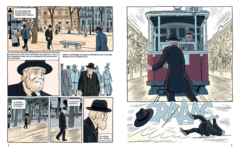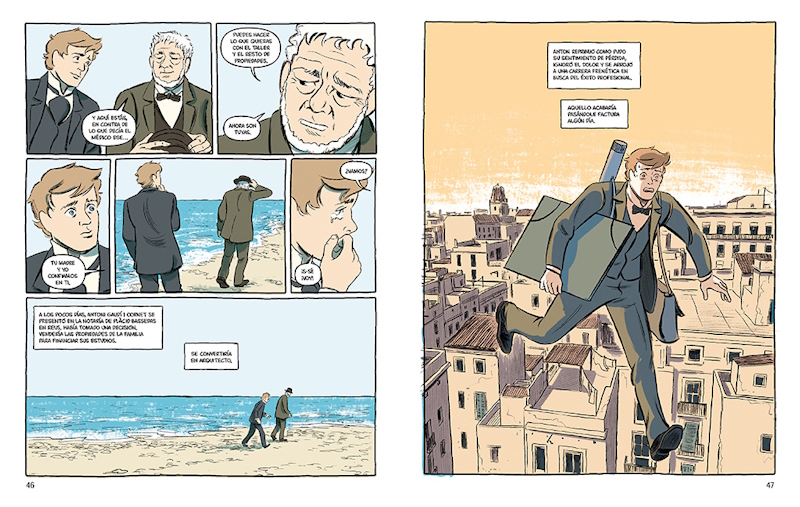 El cómic comienza con el fatal atropello del arquitecto cuando salía de las obras de la Sagrada Familia, para saltar hacía atrás en el tiempo hasta su nacimiento. De esta forma asistimos a un completo recorrido por una compleja trayectoria vital marcada por las desgracias familiares y la pulsión por buscar nuevos caminos en la arquitectura. Una visión que se centra mucho más en la vida íntima de Gaudí que en ser una recopilación de sus obras. Algo que nos permite ver elementos claves de sus vidas como su historia de amor no correspondida con una mujer de ideas muy progresivas para la época y su posterior viraje vital que lo llevo a una vida mucho más espiritual. Un cambio que le alejaría progresivamente de esa burguesía adinerada catalana que había auspiciado algunas de sus obras más célebres para centrarse de una forma obsesiva en la construcción de la Sagrada Familia. Durante su etapa de estudiante somos testigos de las dificultades que experimento con sus maestros por sus ideas nada convencionales sobre la arquitectura influidas por el trabajo de su padre como calderero. Un equilibrio entre genialidad y locura con el que siempre han tenido que lidiar los artistas que se atreven salirse de lo establecido para inventar nuevos cánones, algo que a los más exitosos acaba por proporcionarles una inmortalidad a través de sus obras. Algo que sirve para añadir a la obra una capa de humanidad que nos permite descubrir al ser humano detrás del mito y la forma en la que su vida marca su obra.