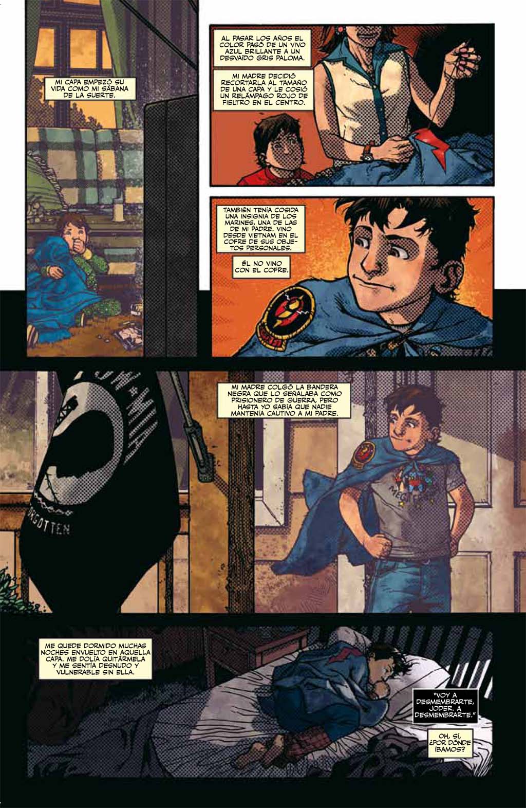 El cómic funciona como una metáfora, no nos lo da todo mascado, esta abierto a alguna que otra interpretación siempre de corte más o menos psicológico pero los poderes de la capa son reales porque su hermano consigue utilizarlos también. La única duda que me dejó a mí es si la capa sólo le conferia el poder de volar o algún otro adicional… porque esa escena llevando un oso a pulso sin tener superfuerza o es una cagada del guión o significa algo por sí misma. No obstante, dicha escena me parece que no acaba de casar con el resto de la obra, habría sido mejor optar por otra posibilidad.