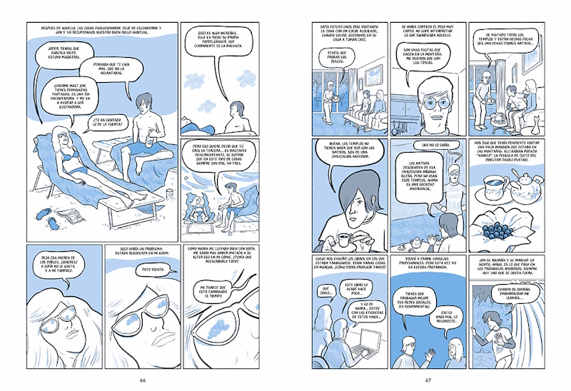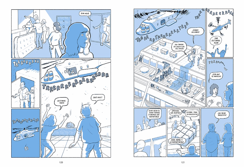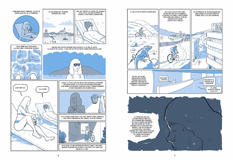 El estilo de Pallardó en esta obra cambia en función de la historia que está contando en ese momento. En la de Martina nos encontramos con el más habitual de líneas claras y limpias emparentado con los trabajos de Daniel Clowes con toques de azul que es color predominante con el gris. Por su parte en la de Eric nos encontramos con un dibujo muy suelto gracias al uso de aguadas con un azul muy suave. En cambio, en la de María tenemos un dibujo mucho más sintético coloreado con tramas grises y un azul oscuro e incluso en la historia de sirenas que lee María nos encontramos con otro estilo diferente de una línea clara que nos recuerda a los trabajos de Hergé y en bitono gris. Ese cambio de técnicas de dibujo y colores sirve para definir perfectamente los diferentes niveles narrativos de la historia con un azul que tiñe toda la historia del toque melancólico de los sueños que parecen imposibles y permite dar profundidad a las imágenes y el uso de sombras. A ese cambio de técnicas plásticas le acompaña una estructura de páginas cambiante que responde a las necesidades de una historia que mantiene un gran ritmo sin que esa narración en off la lastre, ya que el autor sabe cuándo debe prescindir de ella.
