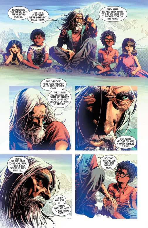 El guion de Brisson es correcto, pero no llega mucho más allá de servicial. Los personajes son bastante planos, y siguen su determinado arquetipo sin muchas sorpresas. El retorno de personajes pasados no llega a explicarse del todo en estos números, y el potencial para plantear paralelismos con el protagonista y el antagonista, y su forma de reaccionar al mundo que les rodea no se aprovecha del todo y queda falta de desarrollo. El mayor problema del guion es una incapacidad para manejar sus giros de forma convincente, y del hecho de que la lección que aprende el protagonista ha sido reciclada hasta la saciedad.