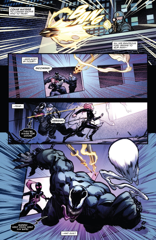 El guion tiene luces y sombras. La parte de Grønbekk mejora sustancialmente sobre lo que vimos en la tanda anterior, principalmente ayudado por no sentirse como una interrupción repentina. La historia y sus protagonistas y antagonistas se desarrollan un poco más. Sin embargo, aunque la introducción de Viuda Negra es cuanto menos interesante, lo que se hace con ella se siente más como un truco publicitario que difícilmente parece pertenecer a esta cabecera. Además, la desconexión entre las dos líneas argumentales del título se siente aquí más prevalente que nunca. El guion de Ewing, aunque no hay mucho que juzgar en esta tanda, construye y construye, y sigue manteniendo el perfil exigente que la cabecera mostraba en sus primeros números. Aunque ya no hila tan fino, se ve un hilo conductor poderoso pero la decisión de alternar entre ambos Brock no ayuda al seguimiento de esta vertiente de la etapa.